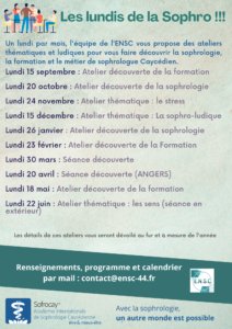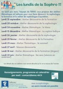 Un lundi par mois, l’équipe de l’ENSC vous propose des ateliers thématiques et ludiques pour vous faire découvrir la sophrologie, la formation et le métier de sophrologue Caycédien. Les détails de ces ateliers vous seront dévoilé au fur et à mesure de l’année, gratuit.